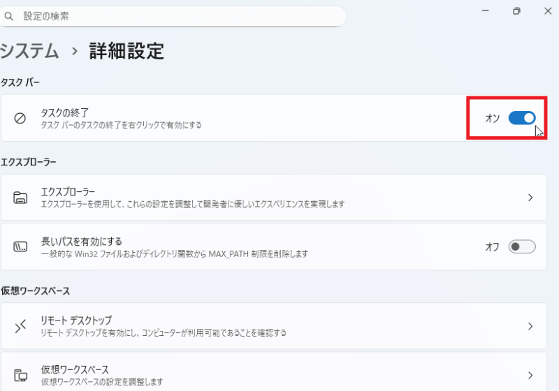 「タスクの終了」をオンにします。